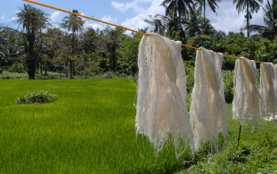 After pineapple harvest, the plant leaves that are left behind are collected in bundles and the long fibres are extracted using semi-automatic machines.