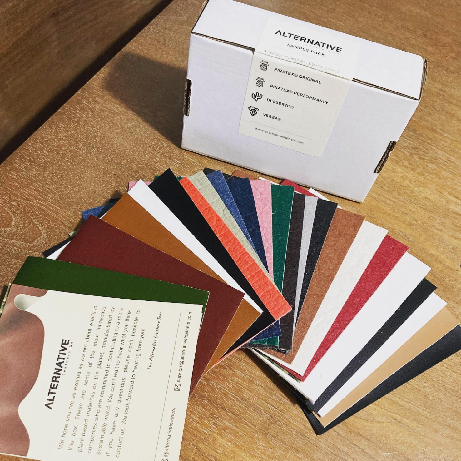 The A.L.C. swatch book contains samples of all of our plant-based materials in each available colour: